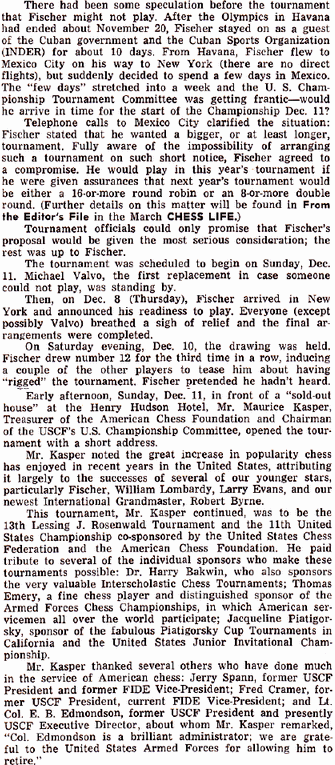 'Fischer wins U.S. Championship (Ho-Hum)' by Burt Hochberg [...] Maybe it wasn't so 'Ho-Hum' after all. This was the eighth and last time that Fischer participated in the U.S. Championship.
